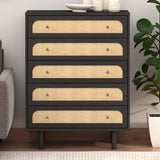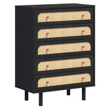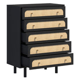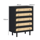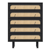 Features: Materials: particleboard & MDF frame, raffia cane front drawer panels, iron drawer runners & handles Includes: 1 x chest of drawers The deep dark hue not only enhances the wood's natural grain but also pairs well with both bold & neutral colour schemes The use of natural accents for the drawer fronts adds natural texture, bringing an organic & earthy element to the room Boasts an elegantly curved drawer front, lending a soft, sophisticated silhouette Offers a timeless look that exudes warmth & luxury in any setting A versatile choice for bedroom décor WARNING Children have died from furniture toppling over Always secure this furniture with an anchor deviceNever allow children to stand, climb or hang on drawers, doors, or shelvesNever open more than one drawer at a timePlace heavy items down lowNever place a television on this furniture