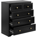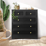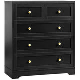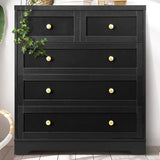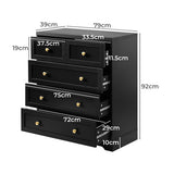 Features: Materials: particleboard with paper veneer finish, powder-coated steel handles, powder-coated stainless steel drawer runners, rubber foot pads Includes: 1 x chest of drawers, 1 x assembly manual Sturdy structure Hassle-free storage with its 5 x spacious drawers Made with carefully-sourced materials matched with meticulous craftsmanship Slick & durable powder-coated stainless steel runners The combination of the black exterior & gold handles suits any modern interior setting & décors WARNING Children have died from furniture toppling over Always secure this furniture with an anchor deviceNever allow children to stand, climb or hang on drawers, doors, or shelvesNever open more than one drawer at a timePlace heavy items down lowNever place a television on this furniture