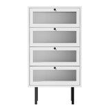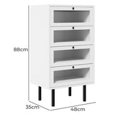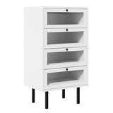 Features: Materials: particleboard frame, powder-coated steel legs, tempered glass drawer panels, powder-coated stainless steel runners, aluminium alloy handles Includes: 1 x tallboy, 1 x assembly manual Combines practical functionality with a modern aesthetic 4 spacious drawers provide ample storage space Smooth powder-coated stainless steel runners ensure easy opening & closing, even fully loaded Offers additional space for various décor ideas, suitable for any room in the home Made with sturdy 1.5cm particleboard & high-quality components, ensuring longevity & durability Powder-coated steel legs provide robust support & facilitate easy cleaning underneath Perfect for the bedroom, study, living room, or hallway; multiple units can be used to enhance any space WARNING Children have died from furniture toppling over Always secure this furniture with an anchor deviceNever allow children to stand, climb or hang on drawers, doors, or shelvesNever open more than one drawer at a timePlace heavy items down lowNever place a television on this furniture