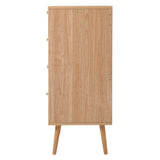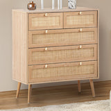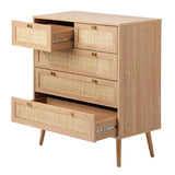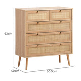 Features: Materials: particleboard frame and tabletop, gum wood legs, genuine rattan drawer panels, aluminium alloy handles, steel runners, stainless steel fixings, plastic foot pads Includes: 1 x chest of drawers, 1 x set of assembly parts, 1 x anti-topple kit, 1 x assembly manual Genuine rattan drawer panels for a timeless, relaxed style Five drawers offer ample space for organising essentials Gold-coloured handles and smooth metal runners ensure easy opening and closing Ideal for bedrooms, living rooms, hallways, or studies 1.5cm particleboard construction with solid wood splayed legs for stability and easy cleaning Spacious top surface for decorative items or everyday essentials Simple wipe-clean surface with easy-to-follow assembly instructions WARNING Children have died from furniture toppling over Always secure this furniture with an anchor deviceNever allow children to stand, climb or hang on drawers, doors, or shelvesNever open more than one drawer at a timePlace heavy items down lowNever place a television on this furniture