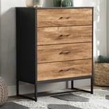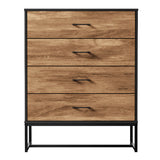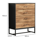 Features: Materials: particleboard with paper veneer, powder-coated iron frame and handles, steel runners, stainless steel fixings, plastic foot pads Includes: 1 x chest of drawers, 1 x set of assembly parts, 1 x anti-topple kit, 1 x assembly manual Natural wood-like finish with rich wood grain textures and metal accents Four large drawers provide ample space for organising essentials Smooth undermount runners and powdercoated black metal handles for easy access Top space ideal for décor, photos, or everyday essentials Elevated metal legs allow for effortless cleaning underneath WARNING Children have died from furniture toppling over Always secure this furniture with an anchor deviceNever allow children to stand, climb or hang on drawers, doors, or shelvesNever open more than one drawer at a timePlace heavy items down lowNever place a television on this furniture