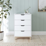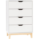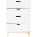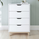 Features: Materials: particleboard frame & drawers, pine wood legs Includes: 1 x chest of drawers, 1 x set of assembly parts, 1 x assembly manual Perfect addition to your bedroom Provides great storage space for all your personal belongings Scandinavian-inspired White laminated finish Comes with a wall bracket for anti-toppling safety Cut-out drawer handle design 4 x drawers WARNING Children have died from furniture toppling over Always secure this furniture with an anchor deviceNever allow children to stand, climb or hang on drawers, doors, or shelvesNever open more than one drawer at a timePlace heavy items down lowNever place a television on this furniture
