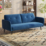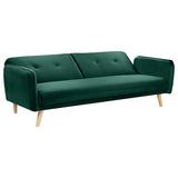 Features: Materials: plywood frame, rubberwood legs, bonnell springs, polyester velvet, foam filling Includes: 1 x sofa bed Click-clack mechanism that allows easy conversion from sofa to bed, in only a few seconds Great space-saving size for apartments or spare rooms Beautiful silky velvet upholstery is eye-catching in any space Splayed, tapered legs give it modern flair Narrow armrests make room for more generous seating space