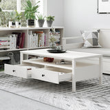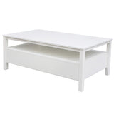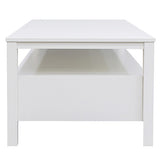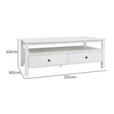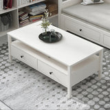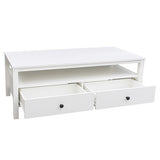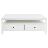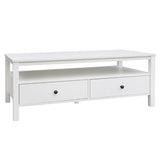 Features: Materials: rubberwood frame, particleboard with melamine finish tabletop, aluminium handles Includes: 1 x coffee table, 1 x assembly manual Easy to keep clean & adds lightness to your space 1 open shelf that you can design with personal decorations 2 spacious drawers provide ample storage space Soft-closing function drawers Folding construction helps you to assemble the drawers quickly & easily Easy to assemble thanks to the wedge dowel that clicks into the pre-drilled holes