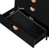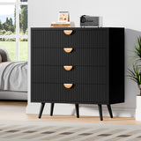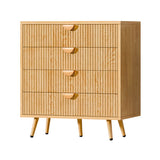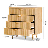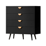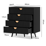 Features: Materials: 1.5cm thick E1-grade particleboard and MDF frame, iron with laminate finish legs, aluminium alloy handles, screw-on felt foot pads Includes: 1 x chest of drawer, 1 x set of assembly parts, 1 x anti-topple kit, 1 x assembly manual E1-grade and 1.5cm thick particleboard Stylish slatted drawer front Four ample drawers for practical organisation Sleek semi-circular handles en a comfortable grip Robust steel legs for long-lasting performance Elevated leg design allows easy access for vacuum cleaners or mops Anti-tipping device for extra stability WARNING Children have died from furniture toppling over Always secure this furniture with an anchor deviceNever allow children to stand, climb or hang on drawers, doors, or shelvesNever open more than one drawer at a timePlace heavy items down lowNever place a television on this furniture