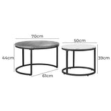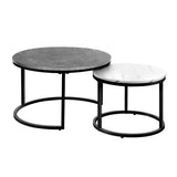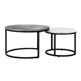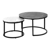 Features: Materials: powder-coated steel frame, MDF with laminated finish tabletop Includes: 1 x small coffee table, 1 x large coffee table, 1 x assembly manual 2-in-1 coffee table for even more space for entertaining or simply doubling the useable area Made from durable board & finished with a marble-effect laminate finish for an exquisite presence 2 interconnected circular metal tube base that extends from 1 singular base Neat & tidy with every use Anti-scratch, easy to clean & maintain Comes with anti-slip rubber feet to ensure that it stays rooted to the spot A highly versatile furniture piece to use in any room Easy to assemble