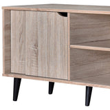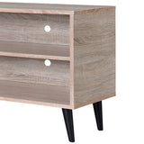 Features: Materials: engineered wood Includes: 1 x TV unit, 1 x set of assembly parts, 1 x assembly manual 4 shelving areas for media players Cable holes for cable management Clean wood grain colour design Tapered & angled legs Top open shelf dimensions: H18.2 x W64.3 x D37cm Bottom open shelf dimensions: H16.7 x W64.3 x D37cm WARNING Children have died from furniture toppling over Always secure your television with an anchor deviceNever allow children to stand, climb or hang on drawers, doors, or shelves